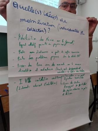 De nombreuses idées ont émergé de la trentaine de personne présente à l'atelier : mobilisation des collectivités sur le besoin en logement paysan, tisser des liens entre nos structures de développement agricole et celles de l'aide alimentaire, mettre en place la sécurité sociale de l'alimentation, parler davantage des problmétiques des agriculteurs dans les Plans Alimentaire Territoriaux, sensibiliser lors des prochaines élections municiaples électeurs et candidats aux enjeux de l'installation, etc.